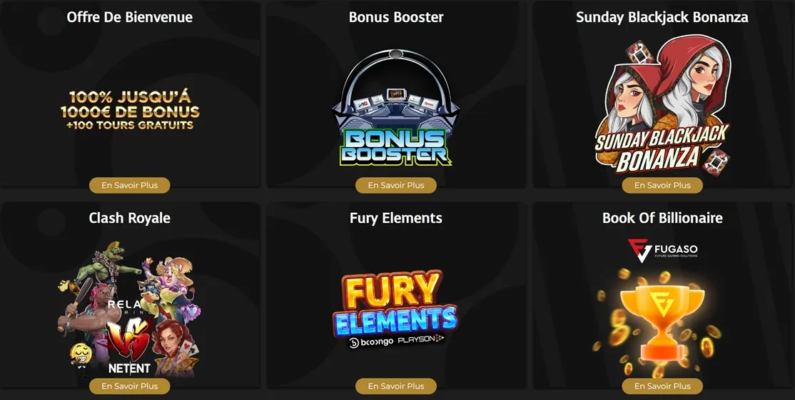 - 1er dépôt : 100 % de bonus jusqu’à 50 € + 100 free spins ;